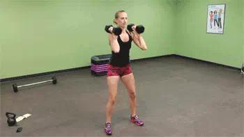 把哑铃在放在胸上部。下蹲,当你站起来的时候双手上推哑铃。