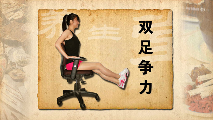 2、双足争力:坐位,双足跟交叉,下腿向前伸,上腿下压,相互争力坚持10秒,双腿交替交替重复20遍。
