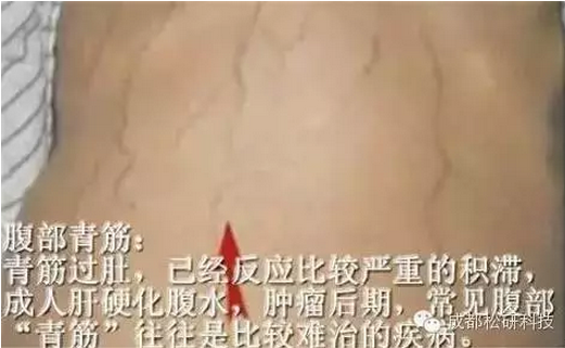 肝病、心病如果出现腹部青筋,说明是比较严重的积滞,往往是较难治的疾病,如肝硬化腹水、肿瘤后期等。脖子上持续有青筋凸起,说明两种情况,一是心功能不全,多见于肺心病等疾病;二是心包炎或心包积液。