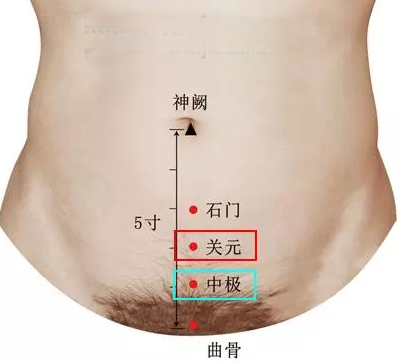 中极穴,在这里我就简单说下,此穴位于脐中下4寸,其治疗作用与关元、气海相同。这里我要说明的是此穴孕妇禁灸。但对于产后及术后尿潴留患者可艾灸或针刺,尤其对于男子性功能障碍患者配合关元、三阴交针刺或者艾灸效果可行。一般一个月为一疗程。对于痛经女性在来月经前一周,可以用白芥子研末贴在此穴上,4小时后取下,两个月经周期为一疗程,颇有疗效。