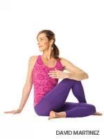 Sit inDandasana柱式坐姿,朝胸腔拉起右膝盖,把右脚放在左膝外侧的地板上。左脚拉进来朝向右侧坐骨。右手放在身后保持和骶骨在一条中线上,左手臂包裹你的右腿。当你延展脊柱时,下压你的右脚和手,从腹部开始移动扭转向右侧。把右膝拥入左肩。感受右臀部外侧的伸展。保持5个呼吸。重复另一边。