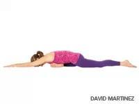 从下犬式开始,将右小腿向前向下,这样你的右脚就会在你左髋部的前侧,右小腿几乎平行垫子的前侧。勾起右脚。当你左髋部向前时,伸展左大腿后侧。随着右腿的折叠,延展你的腹部。如果你的右臀部不容易接近地板,在右侧坐骨下垫一个折好的毯子或砖。停留10个呼吸,重复另一侧。
