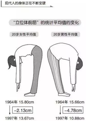 实际上,根据公布的“立位体前屈”统计数据,对比1964年和1997年的平均值,20岁男子的测试平均值由15.66cm降低至10.88cm,20岁 女性的测试平均值由15.80cm降低至13.67cm,男女双方都呈下降趋势,证明现代人身体的柔软度比过去有较大下降。