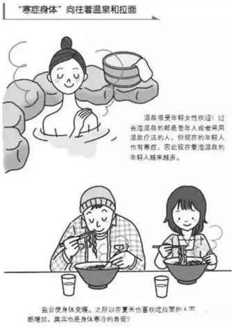 除了运动不足之外,“寒症”和“过食”也是造成身体硬化的重要原因。当今时代,人们总的来说处于“寒症”和“过食”状态。而 且已经到了非常严重的地步。在国内,过去泡温泉的都是老头老太太,而现在在年轻人中也很流行。这是为什么呢?其实这正是大家身体存在寒症的有力证据。虽然 人自身并未感觉到不舒服,但对寒症反应灵敏的身体本能却驱使人们去泡温泉。在国内,这几年爱吃拉面的人也越来越多了。我怀疑这种现象也与“寒症”有关系。